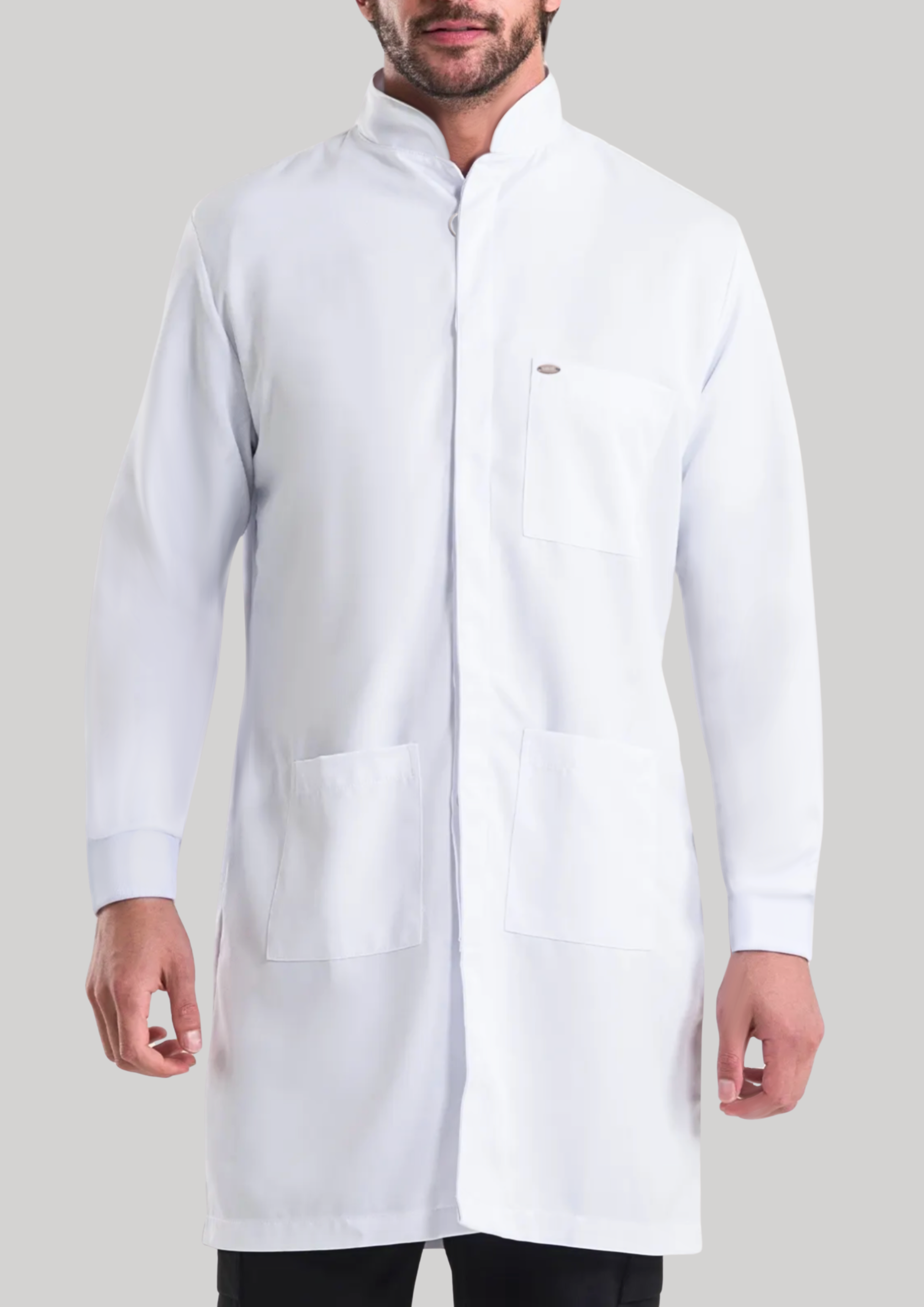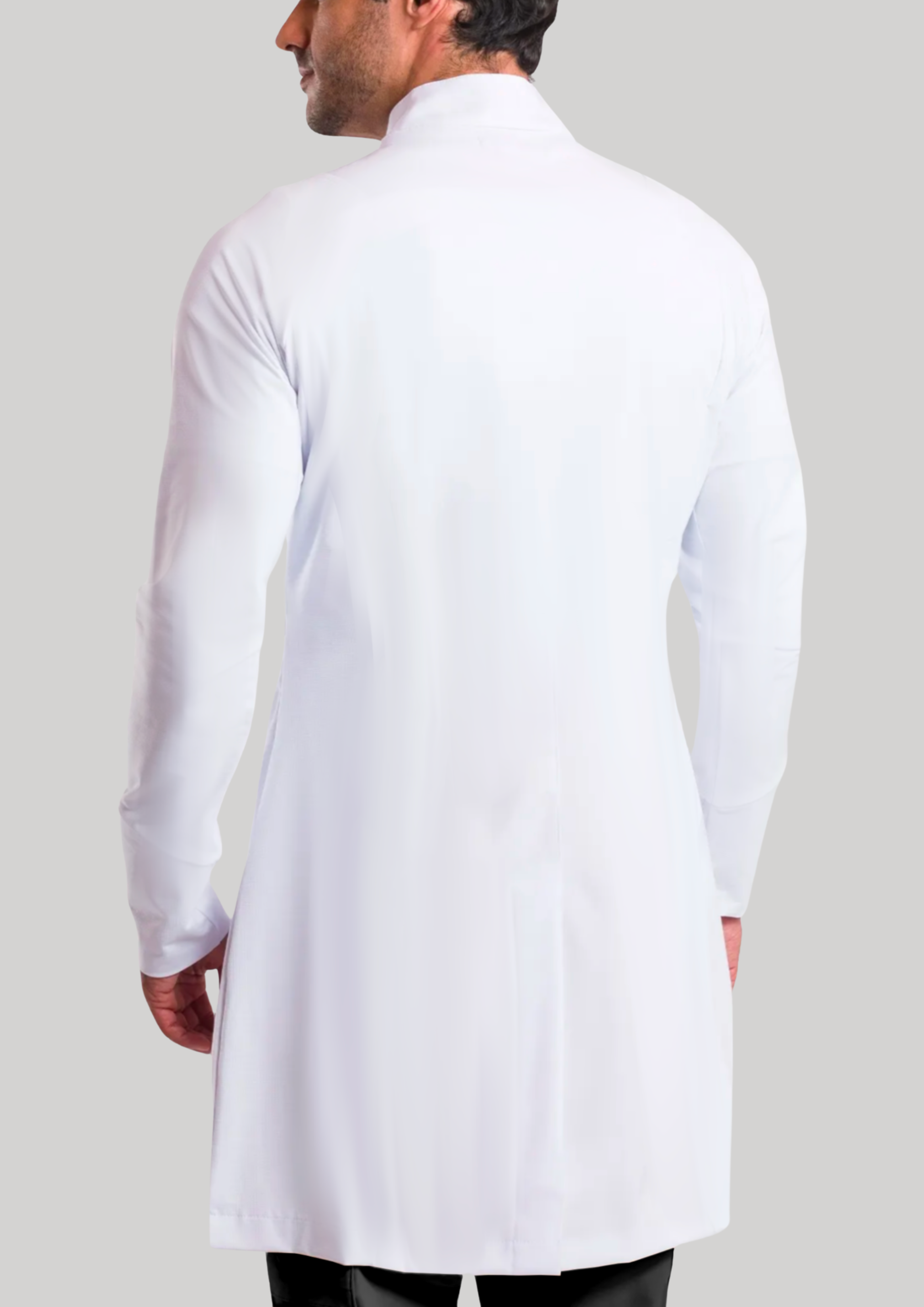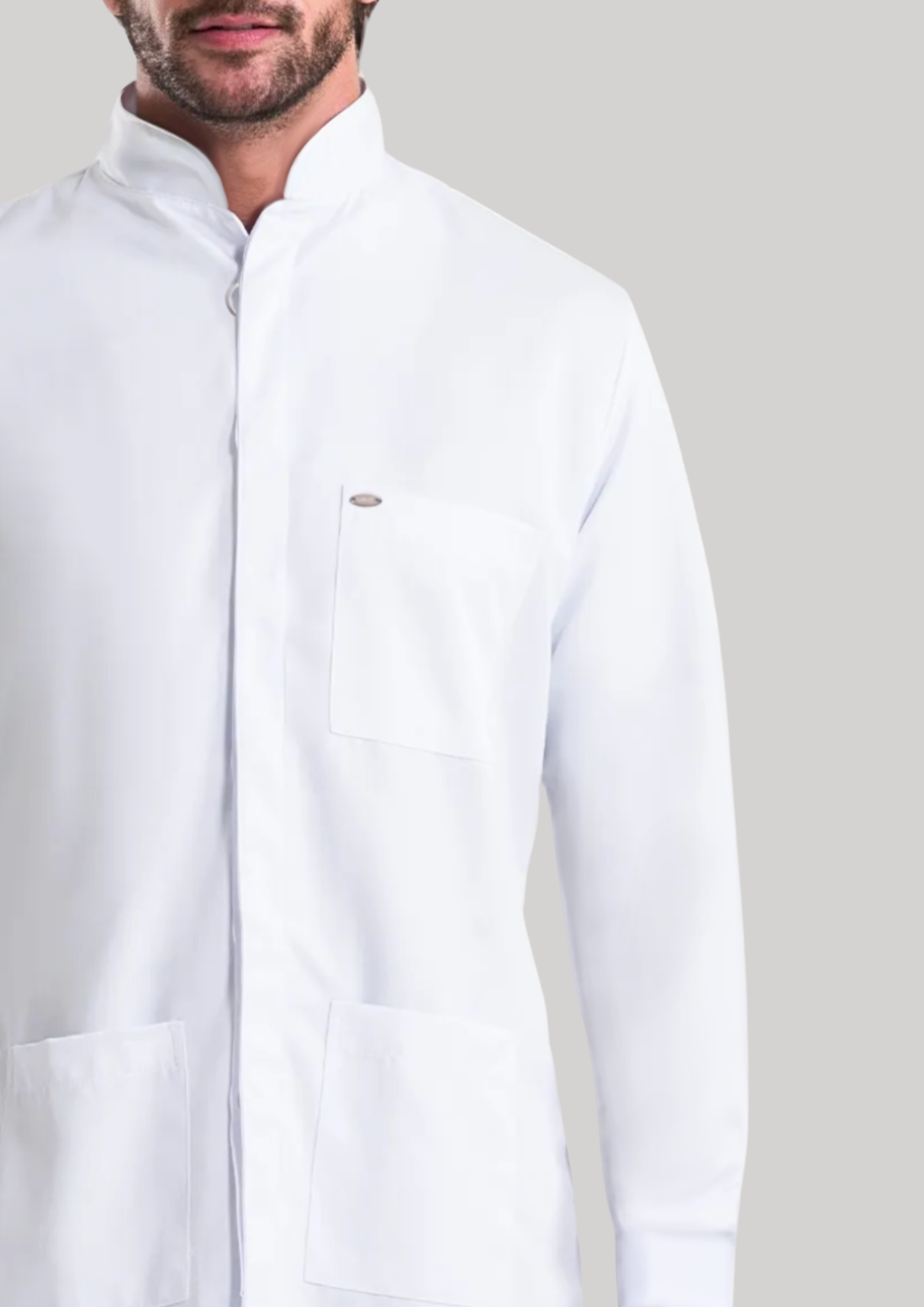 Bata para caballero realizada en tela drill anti-fluido stretch de La Fayette, garantizando calidad superior, protección y confort.