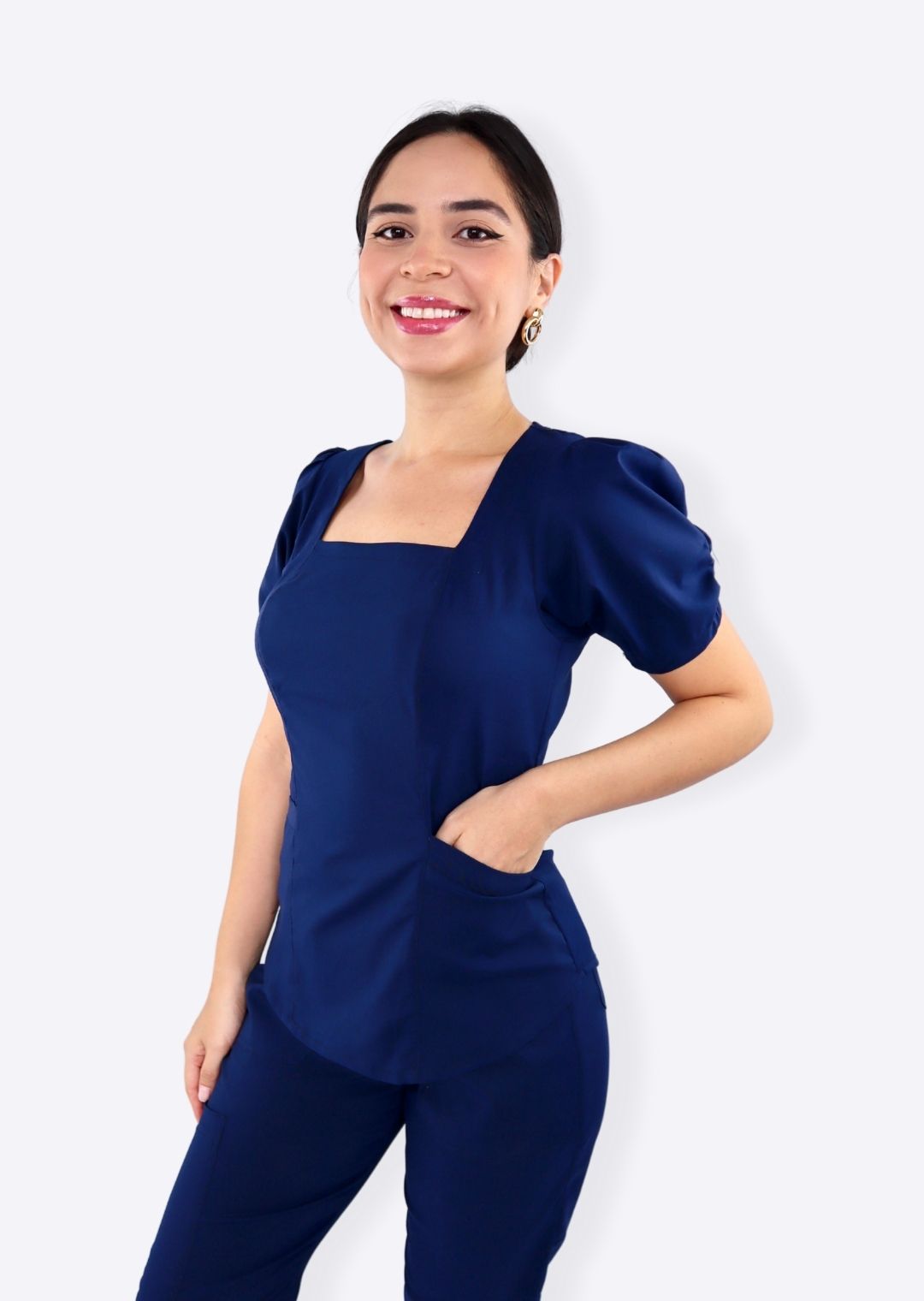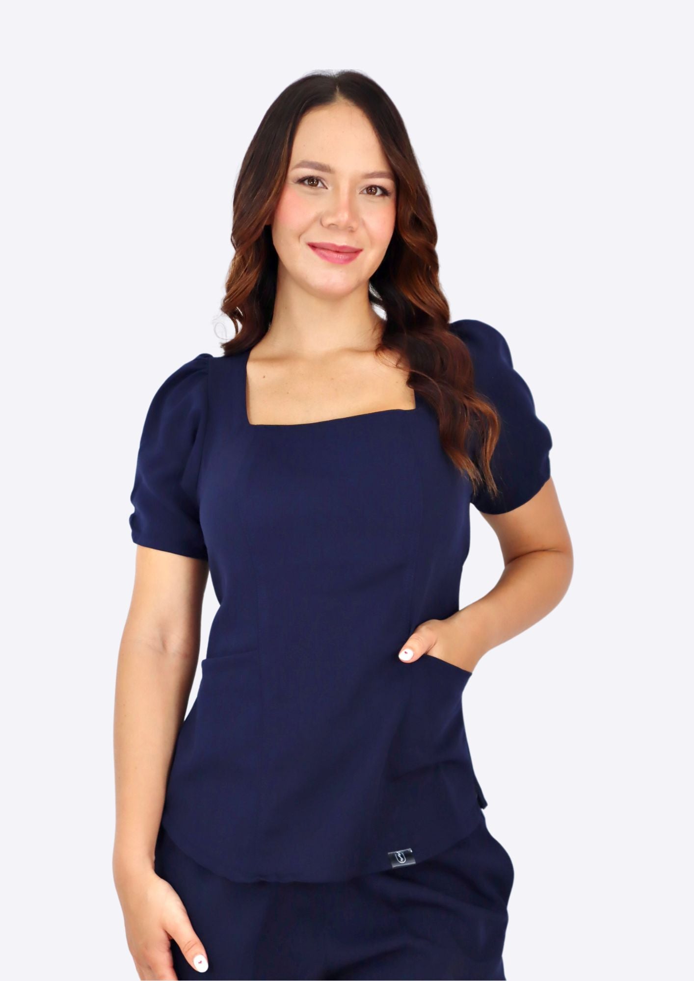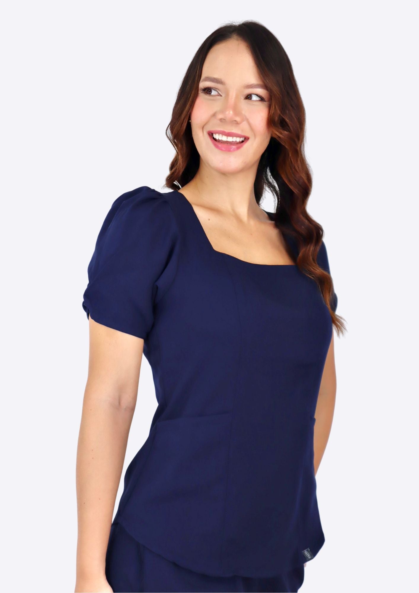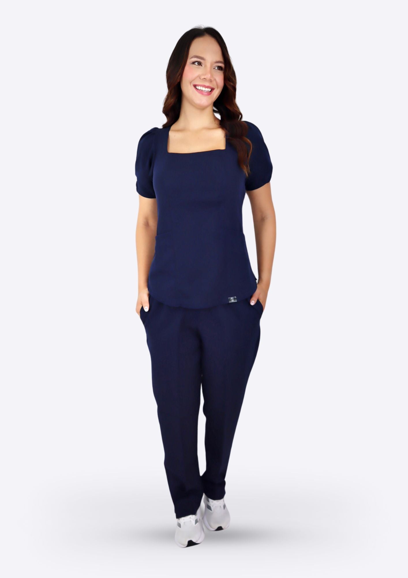 Uniforme con blusa de escote cuadrado, cierre invisible en el lado, mangas semi-globo, 2 bolsillos delanteros y Pantalón recto con bolsillos.