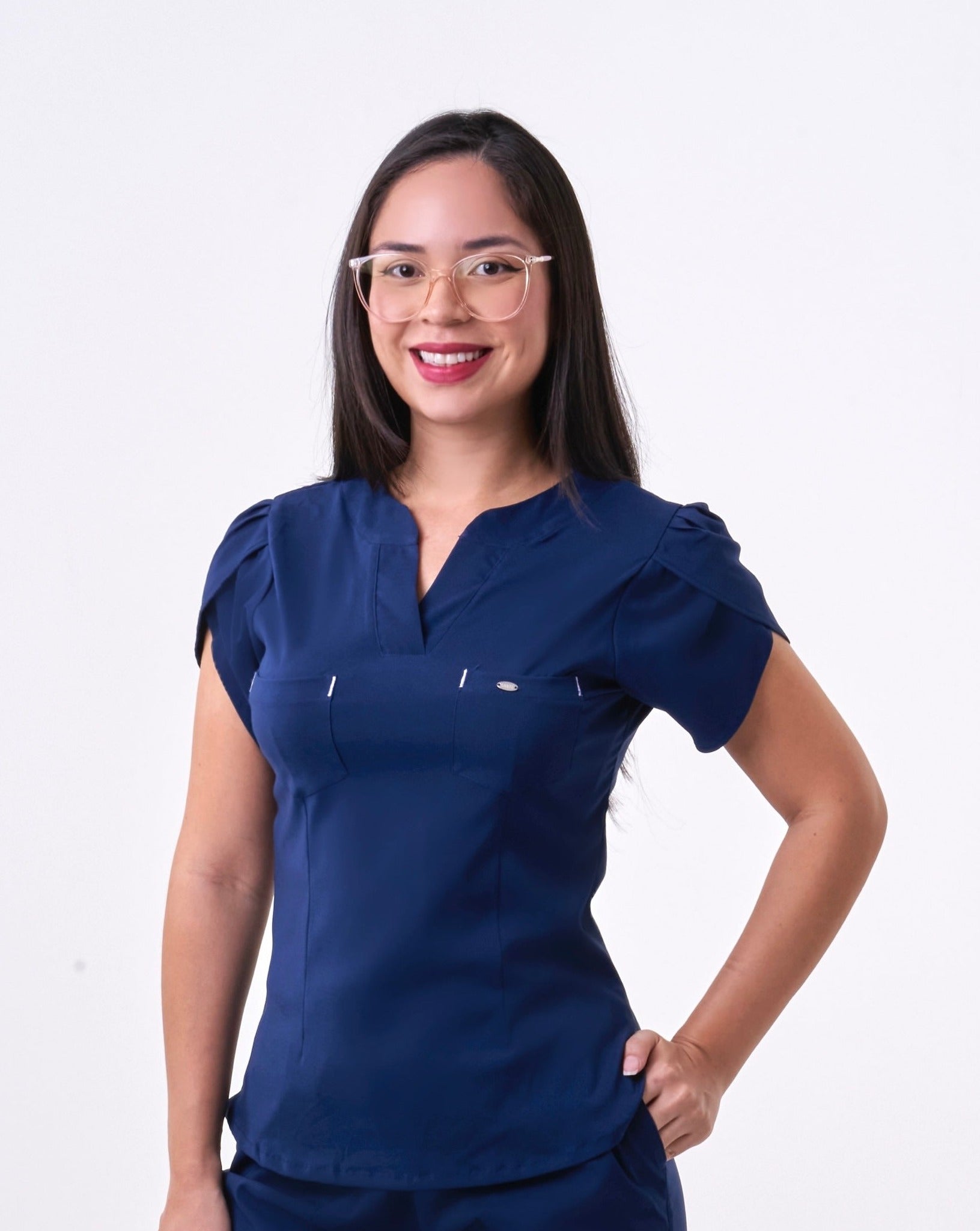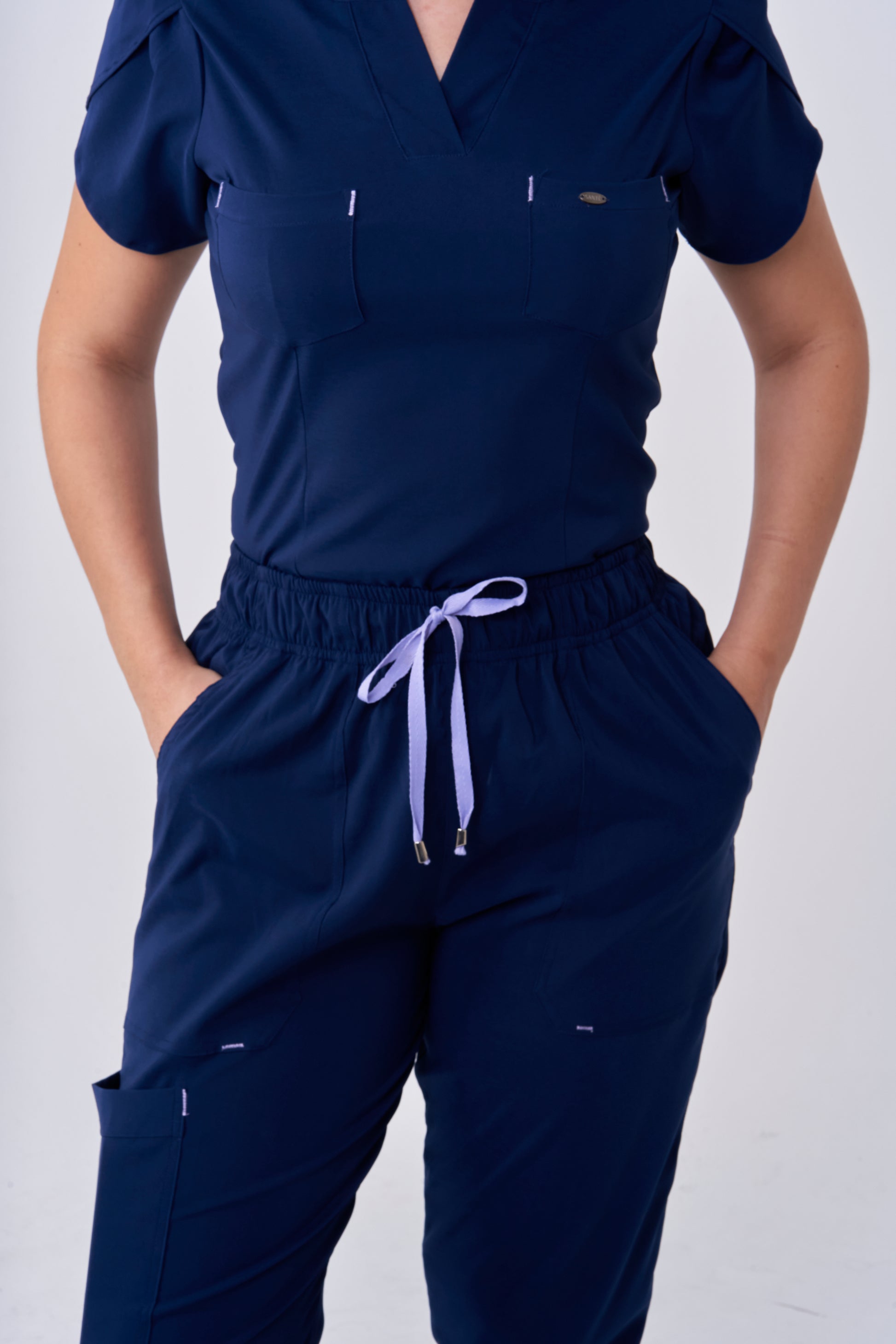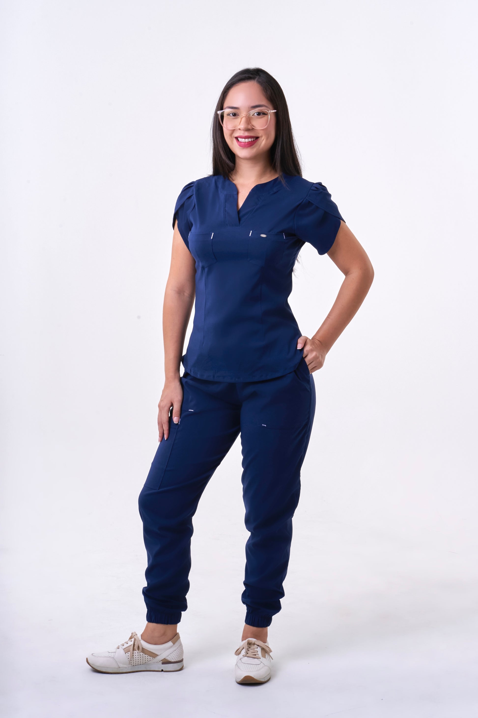 Uniforme con blusa de mangas estilo tulipán, cuello mandarín, bolsillos camiseros y opción de pantalón estilo jogger o recto.