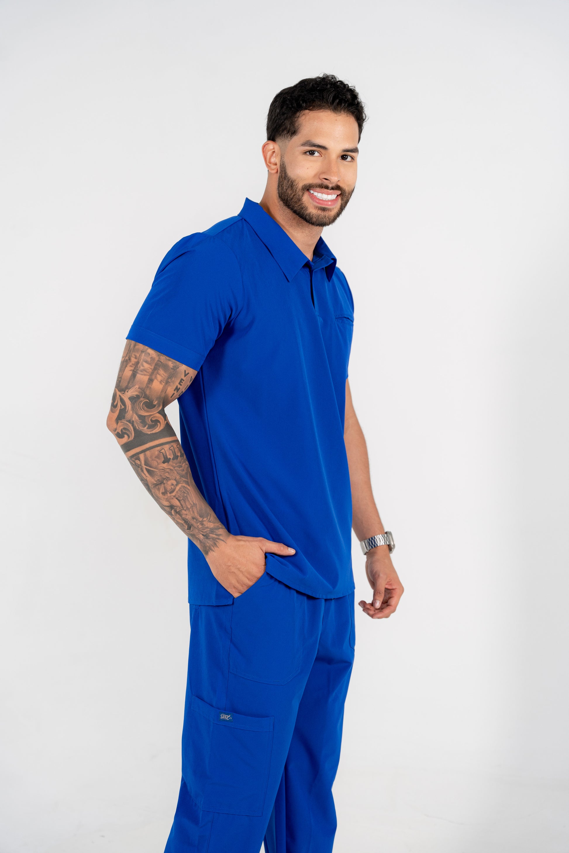 Uniforme para caballero: Camisa con cuello estilo polo y pantalón con bolsillos, opción de pantalón recto o joggers.