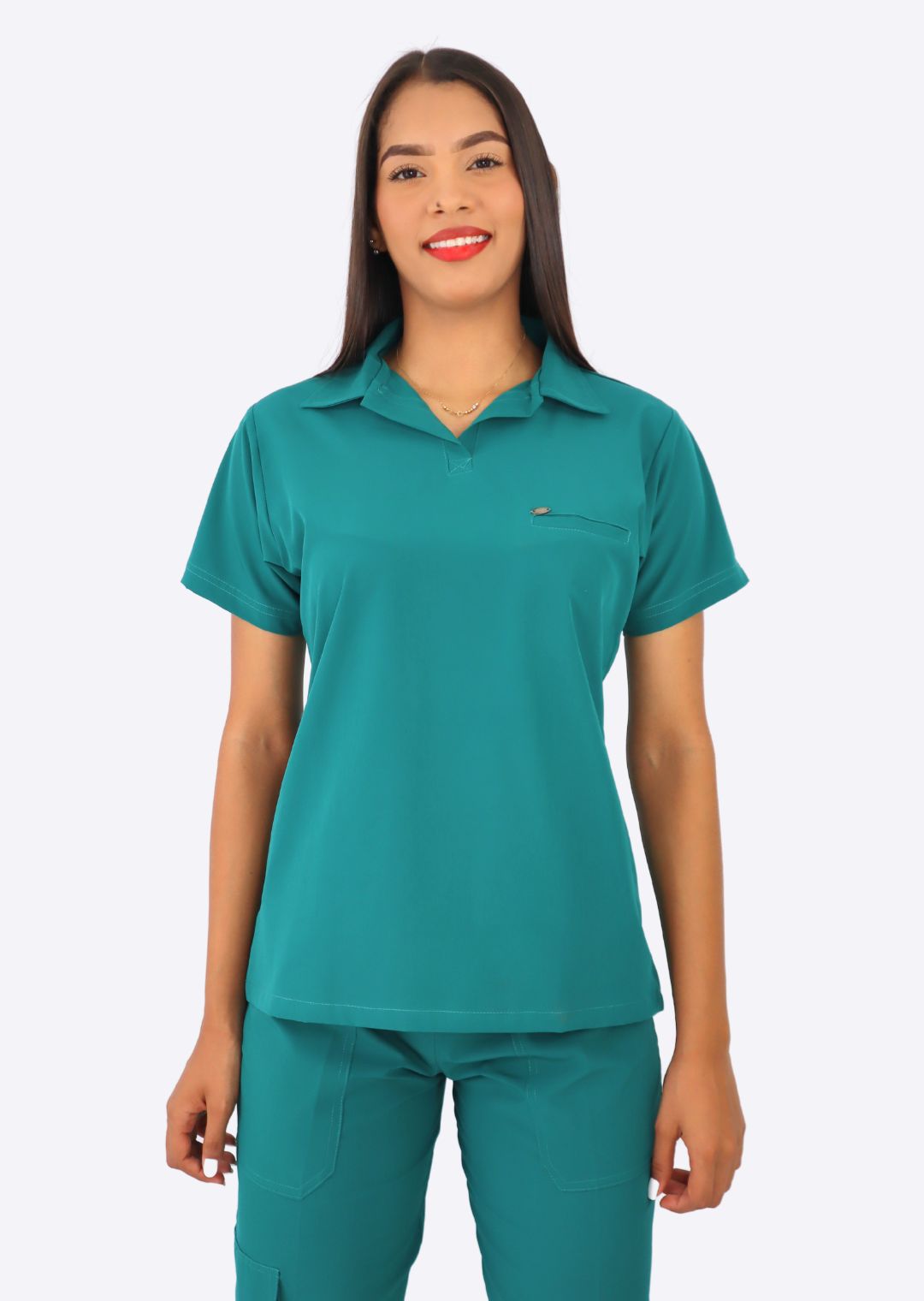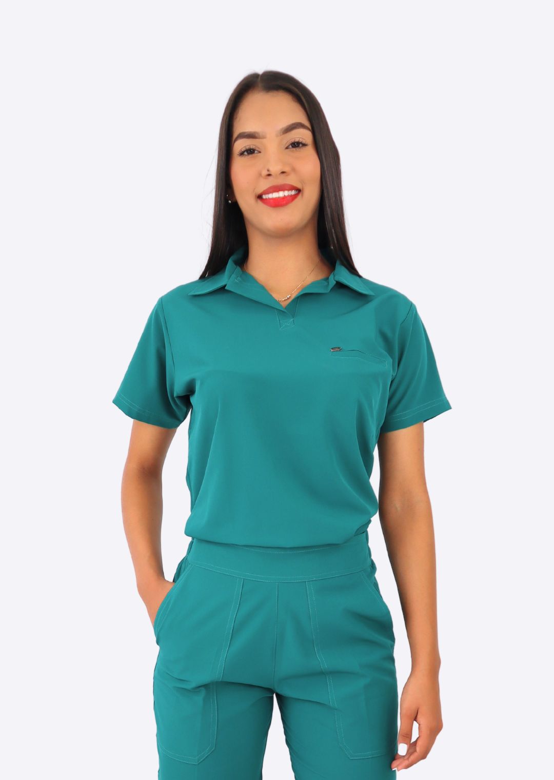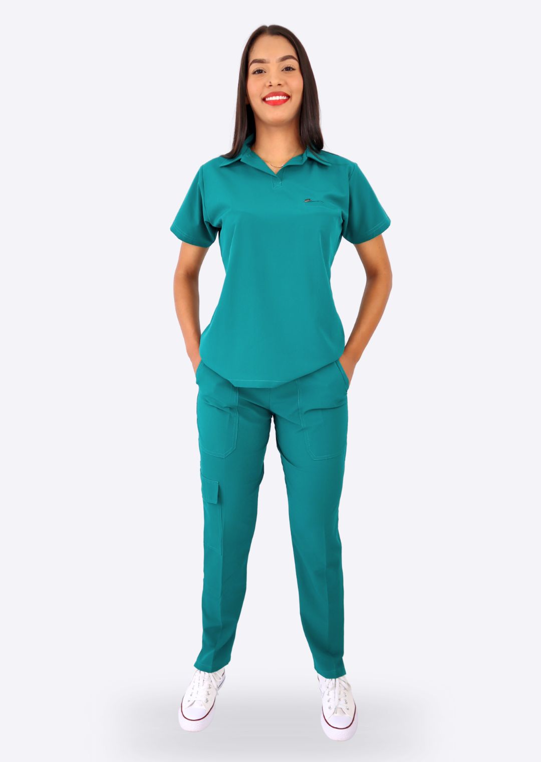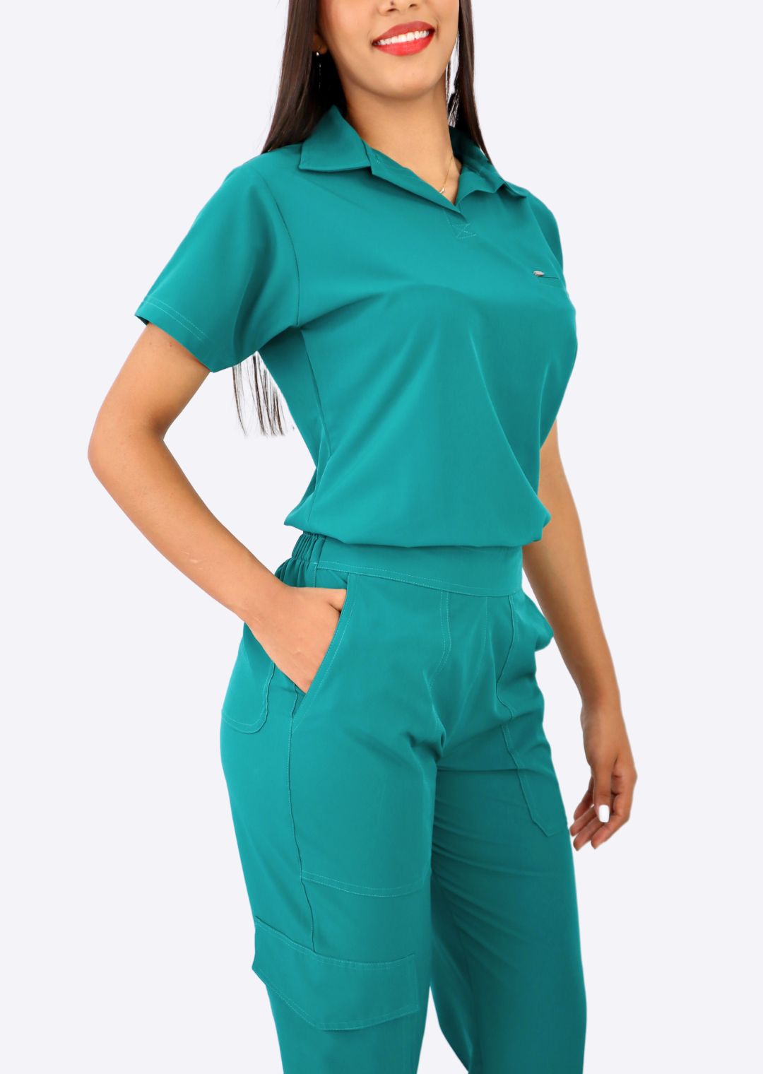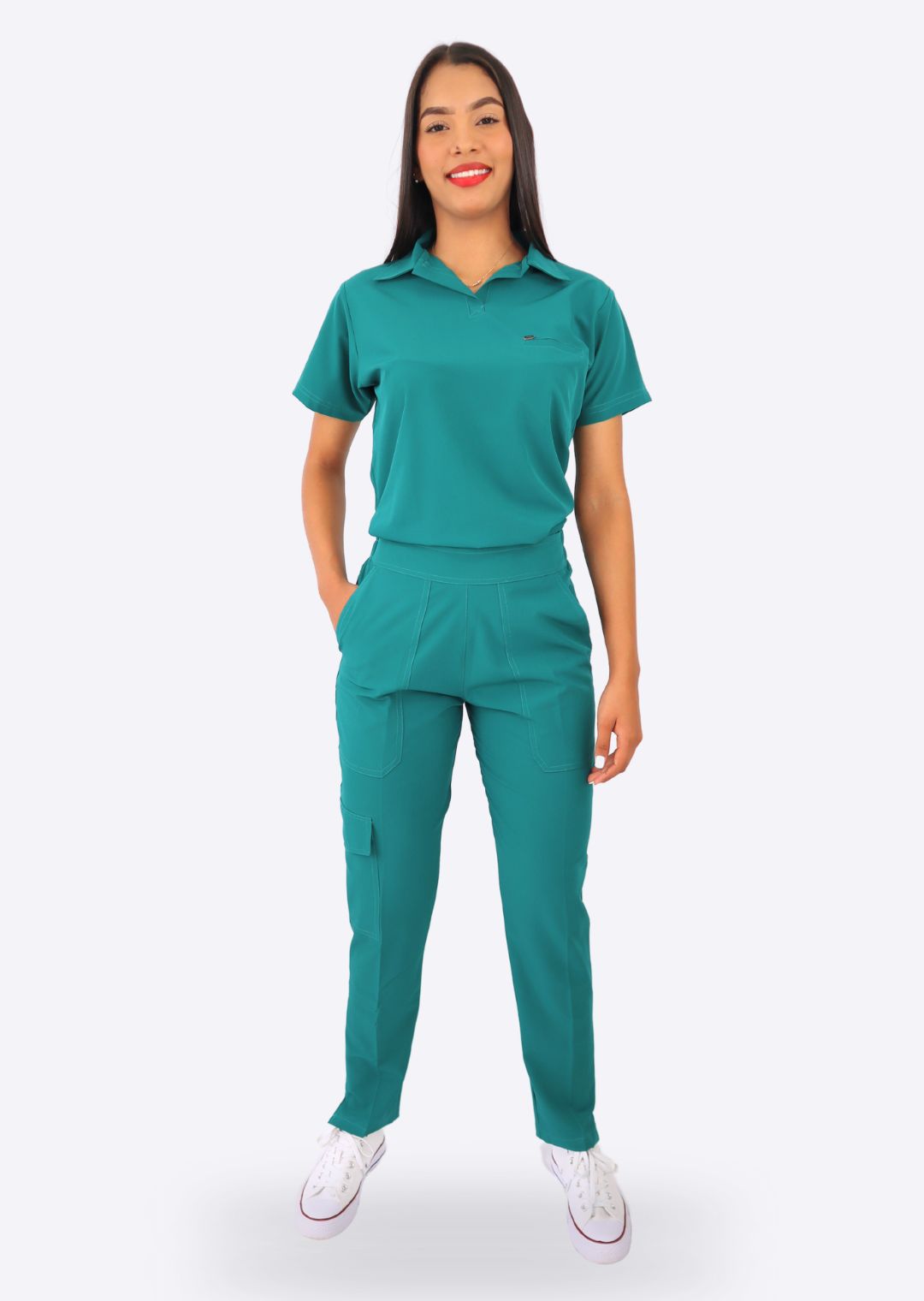 Uniforme con blusa estilo polo y pantalón recto con bolsillos y pretina lisa frontal para mayor comodidad.
